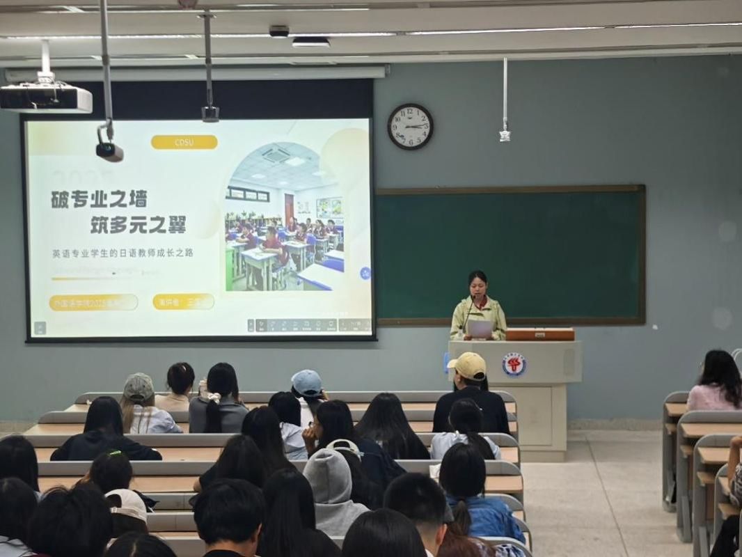 随后,王国全结合大运会语言服务经历,分享了从英语专业跨界日语教学、借助线上平台开辟职业新赛道的独特经验,生动展现跨专业求职的实践路径,诠释了 “专业深耕 + 跨界融合” 的职业发展逻辑,为同学们应对就业挑战提供了新思路。
