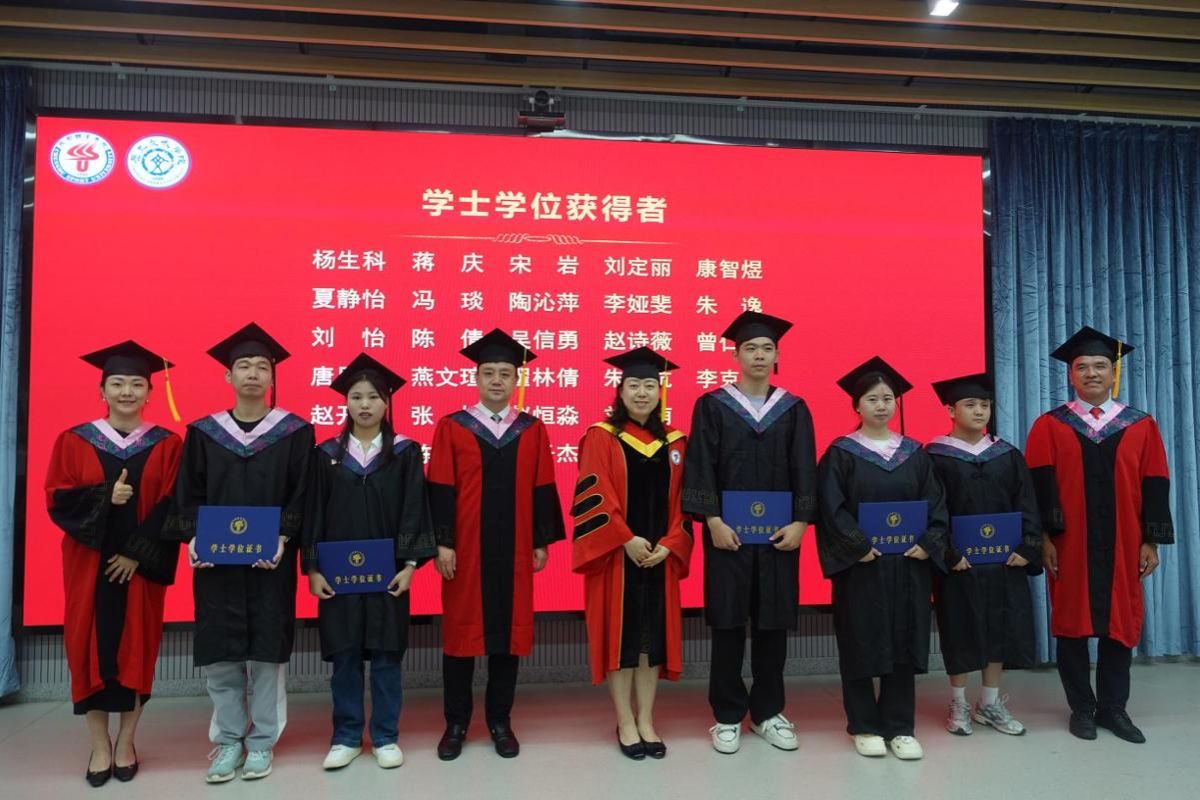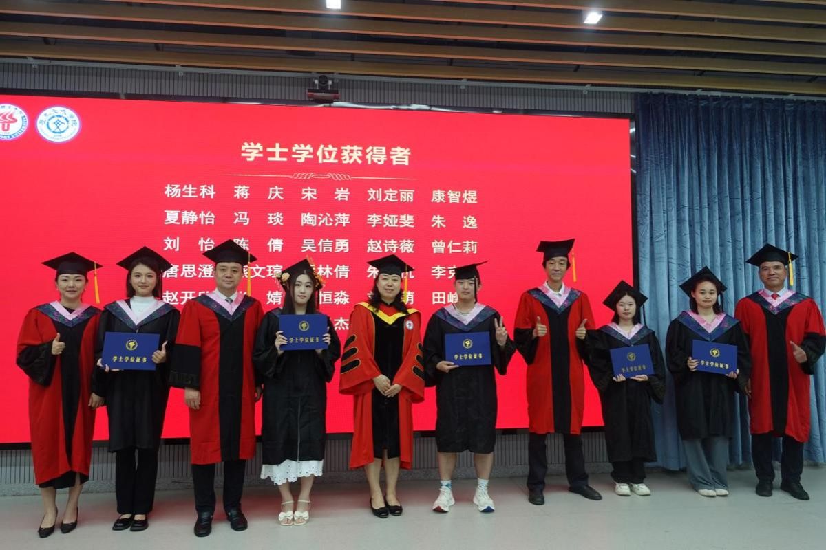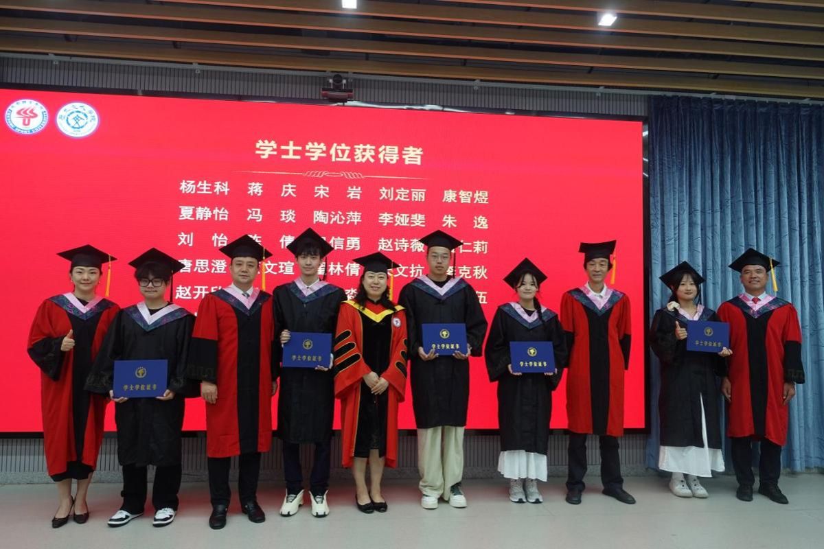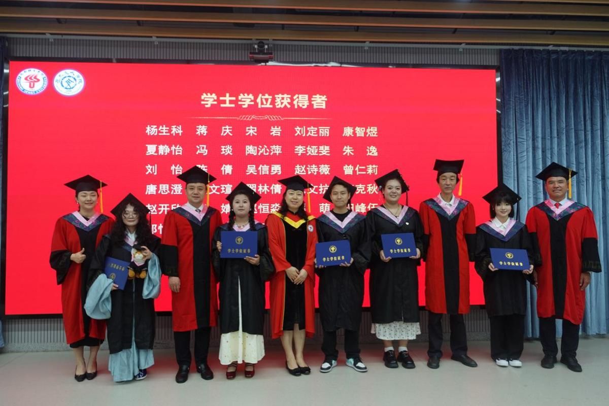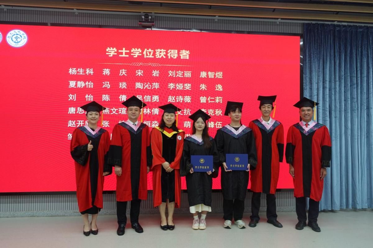 历史文化学院学位分委员会秘书吴丹老师宣读授位决定,学院学术委员会全体委员——宋秀平教授、张新教授、王洪珅教授、刘合智副教授、张玲玲副研究员上台为博士、硕士及本科毕业生授位。