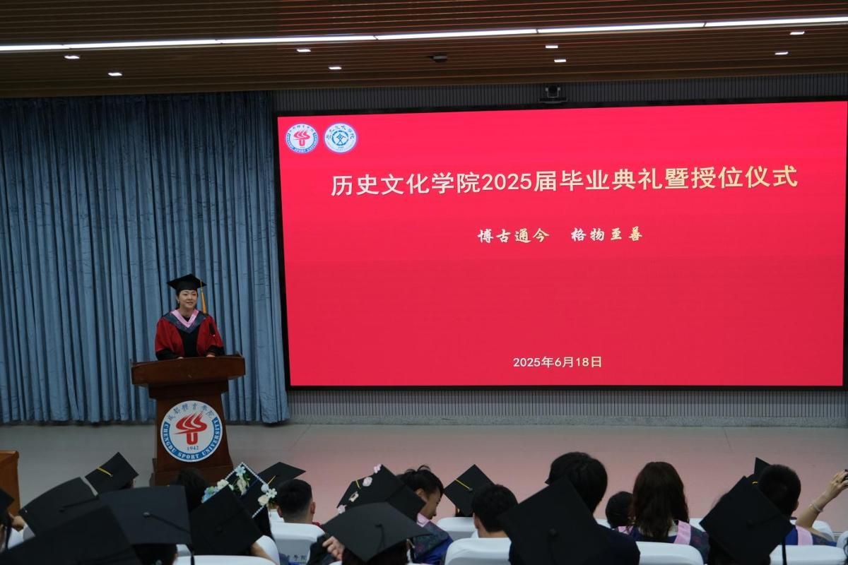 6月18日上午,历史文化学院2025届毕业典礼暨授位仪式在行健楼A100多功能厅隆重举行。历史文化学院全体师生、毕业生亲友团参加了典礼。典礼由学院党委副书记张玲玲副研究员主持。