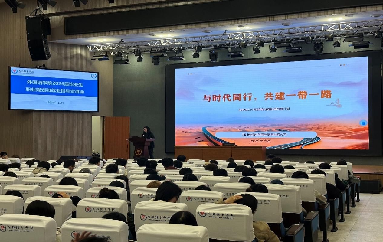 为提升毕业生求职能力、拓宽就业渠道,扎实推进学院2026届毕业生就业工作,11月6日上午,外国语学院在图书馆2楼学术报告厅举办2026届毕业生职业规划宣讲会。会议特邀四川启程新贸国际贸易有限公司董事长杨思冰、总经理白光隆、总经理助理苏杭,宣讲会由苏杭担任主讲,全体2026届毕业生参加。