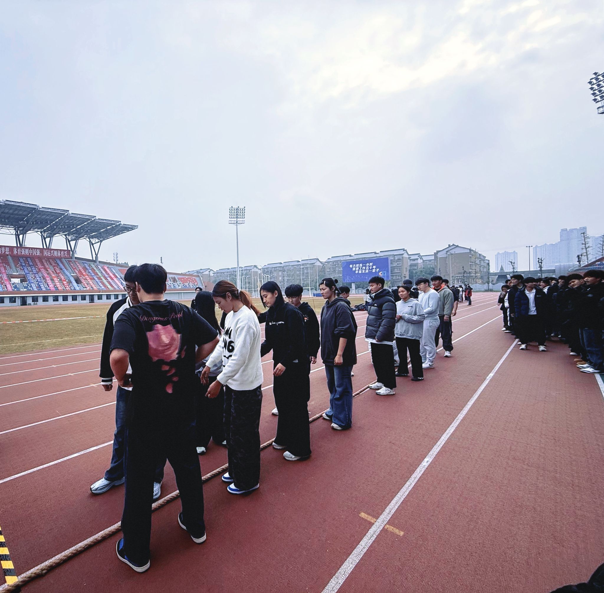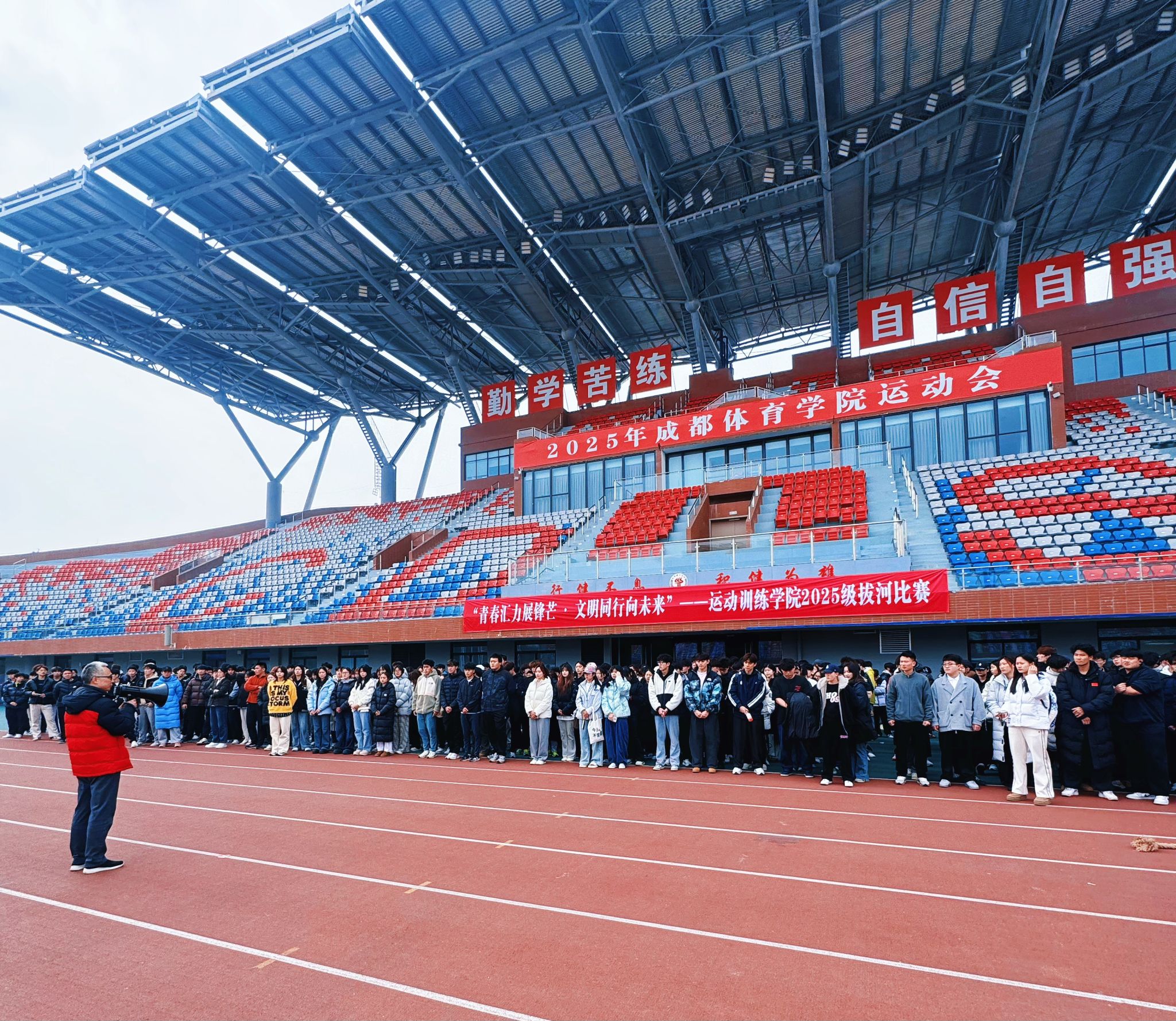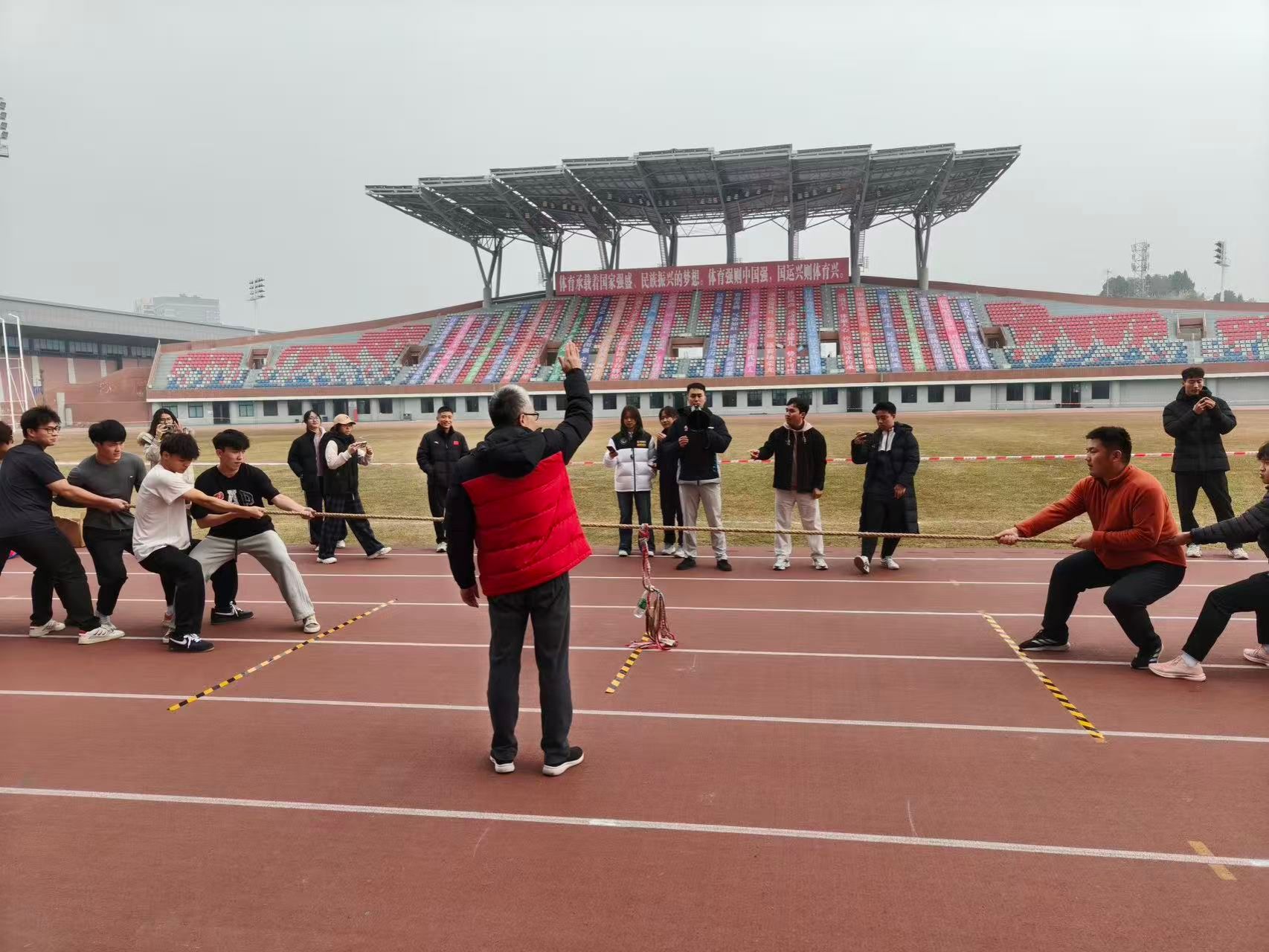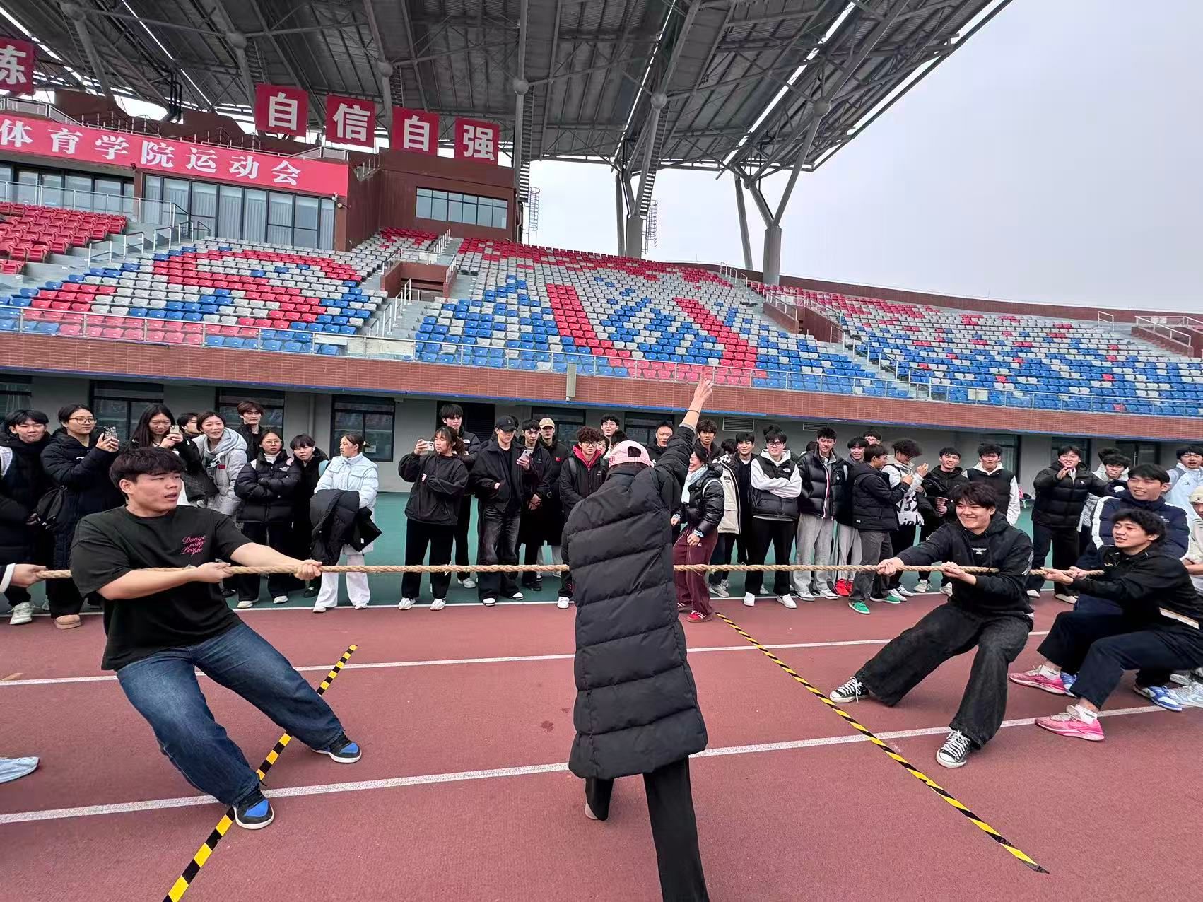 2025年12月9日中午,第一田径场活力迸发,运动训练学院2025级拔河比赛顺利开赛。学院党委副书记朱勇、全体辅导员、班主任到场,2025级全体同学参加。