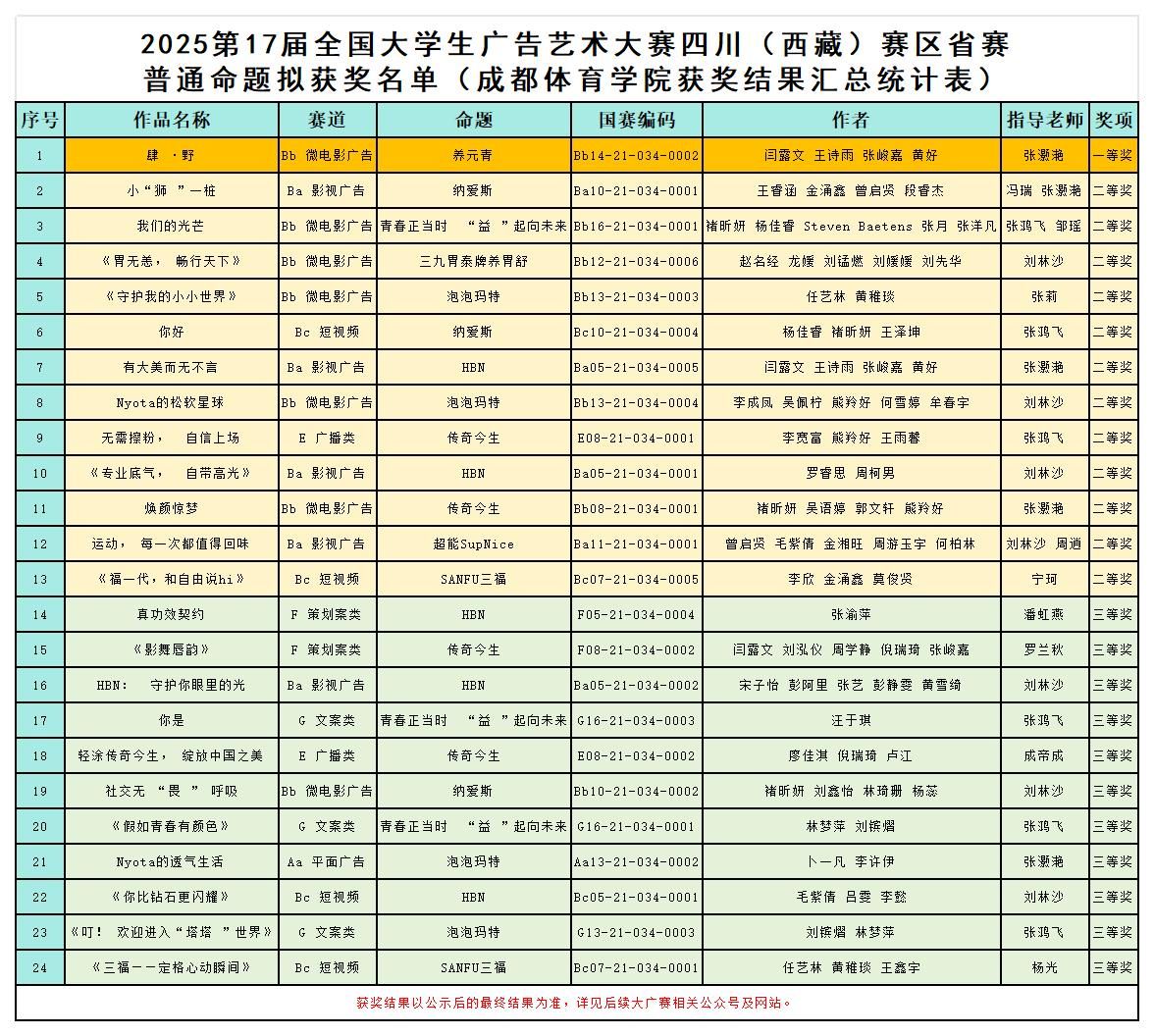 2025年第17届全国大学生广告艺术大赛四川(西藏)赛区省赛普通命题成都体育学院获奖作品公示
