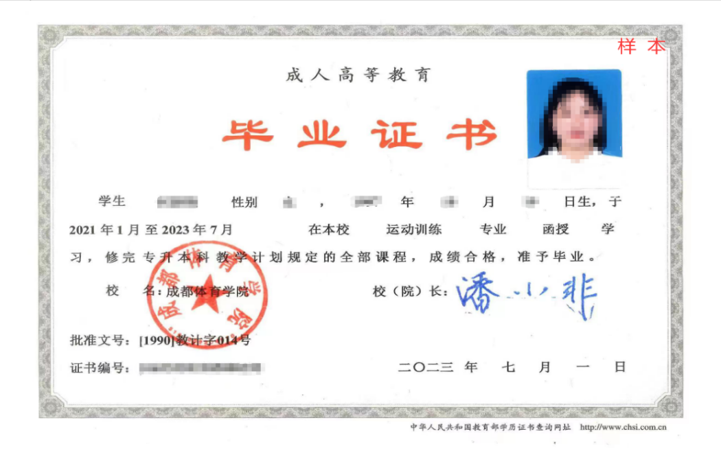 学生在规定的修业年限内,修完教育教学计划规定内容,成绩合格,达到学校毕业要求的,学校准予毕业,由成都体育学院颁发国家承认学历的成人高等教育本、专科毕业证。