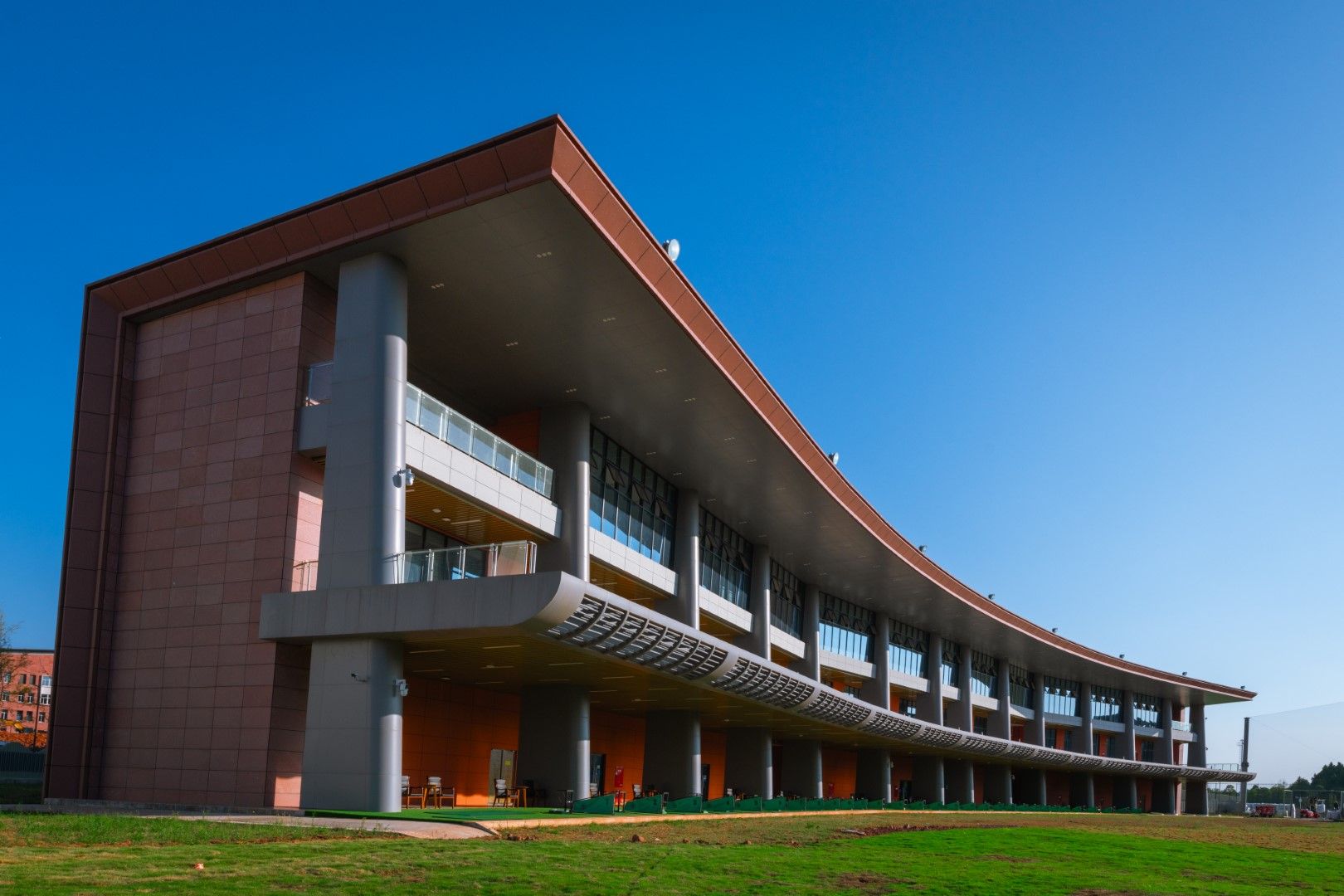 场馆介绍:高尔夫训练馆建筑面积为8240.83平方米,地上三层,建筑高度16.5米,框架结构。设有训练打位76个及各类展览馆、实验室及训练馆若干,并配套建设有高尔夫训练打场,配有果岭区和沙坑区,供在练习木杆和长铁杆之余,还可以练习推杆、沙坑杆和短杆,是高尔夫专业学生及高尔夫爱好者练习挥杆以及接受专业培训的场所,可作为全民健身高尔夫活动举办场地或其他室外休闲体育活动健身场地。另有约7.5万平方米户外高尔夫球场供教学及休闲。