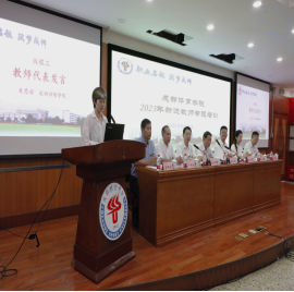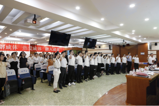 在开班仪式上,人事处副处长、人才工作处副处长、教师发展中心主任杨成波介绍了新进教师基本情况和专题培训工作安排;运动训练学院新入职教师朱思羽代表新进教师发言,表态将坚守教师职业操守,坚定理想信念,贯彻学校重大战略,与成体共成长。学校领导和职能部门负责人为新进教师代表佩戴了校徽,全体参会人员在四川省优秀教师、国际合作与交流处副处长杨飞领誓下进行了庄严的入职宣誓。