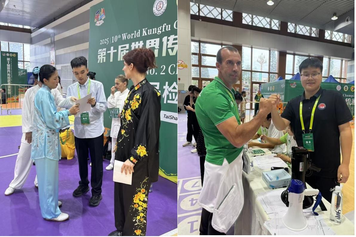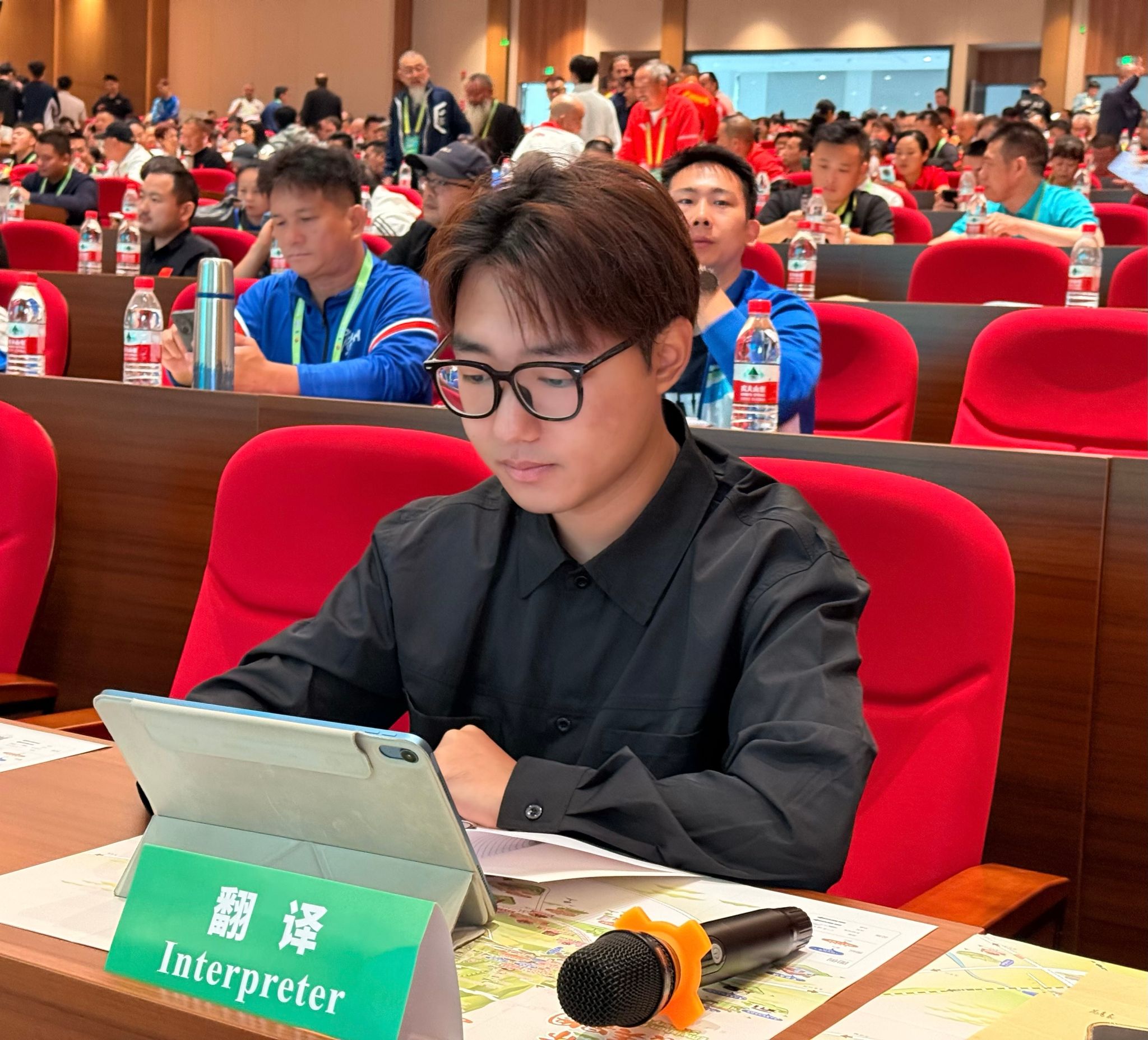 在比赛场外,更有在检录、编排、媒体采访等岗位的学生默默奉献。2023级体育翻译方向研究生莫龙祥和2024级体育翻译方向研究生刘平山、李川疆、苑永明四位检录组翻译人员,以专业服务为赛事检录环节保驾护航。2025级体育翻译方向研究生王天晓、刘仔健和王鑫宇等同学在会议翻译、颁奖检录、媒体采访等工作中紧密配合。面对外籍运动员,他们主动上前沟通,用熟练的外语解答检录流程、赛程安排等疑问,及时消除语言障碍,帮助外籍运动员快速熟悉环节、适应节奏。同学们的高效服务,不仅保障了赛场外环节的有序高效,更以专业态度展现了赛事服务温度,为世界传统武术锦标赛的顺利推进提供了有力支持。