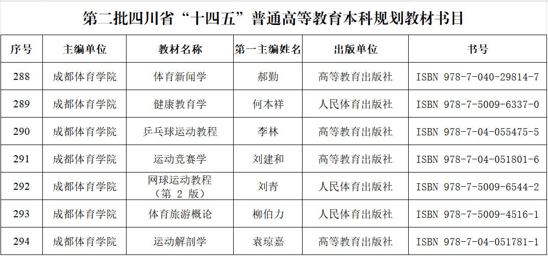 近日,四川省教育厅发布《四川省教育厅关于公布第二批四川省“十四五”普通高等教育本科规划教材书目的通知》(教函〔2025〕296号),我校再添7部教材入选。截至目前,学校共有13部教材入选四川省“十四五”普通高等教育本科规划教材,其中第一批6部已全部推荐国家级规划教材遴选,13部教材涵盖了体育学、医学、新闻学等优势学科领域,充分发挥了我校在优势教材建设方面的示范与引领作用,彰显了学校在体育学学科建设与教材建设中的领先地位。