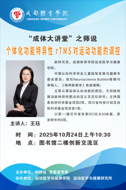 学校将于2025年10月24日(周五)上午10:30在图书馆二楼创新交流区举行“成体大讲堂”科研讲座系列活动之师说。本次讲座特运动医学与健康学院王珏副研究员主讲。题目为:《个体化功能特异性rTMS对运动功能的调控》。欢迎全校师生积极参加。