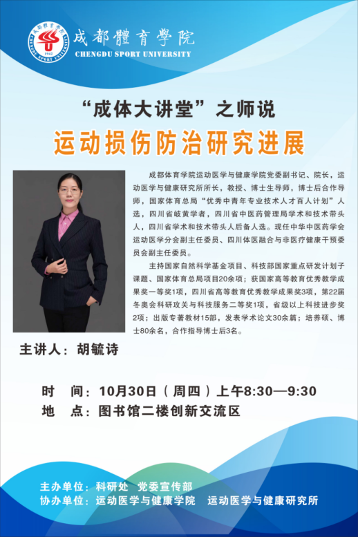 学校将于2025年10月30日(周四)上午8:30在图书馆二楼创新交流区举行“成体大讲堂”科研讲座系列活动之师说。本次讲座特运动医学与健康学院胡毓诗院长主讲。题目为:《运动损伤防治研究进展》。欢迎全校师生积极参加。