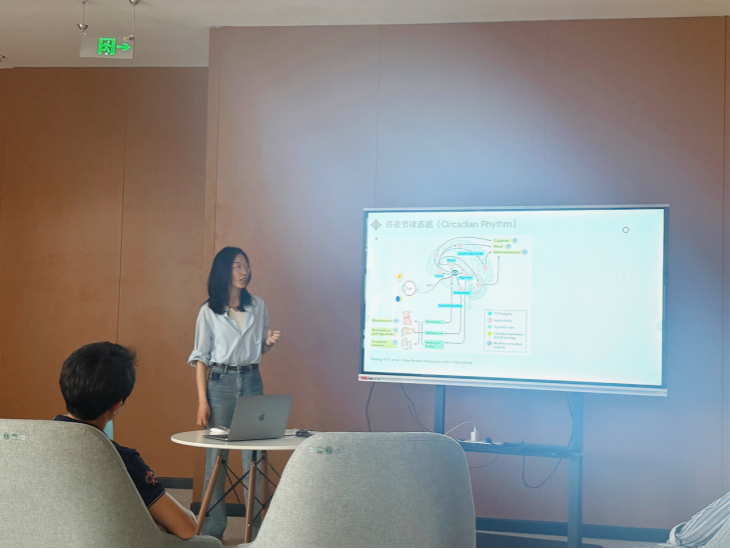 刘沛洁博士以《推拿调节睡眠节律的研究进展——星形胶质细胞谷氨酸在推拿改善节律紊乱中的机制研究》为题展开报告,从睡眠节律的调控机制、推拿改善睡眠节律的临床研究及星形胶质细胞谷氨酸的效应机制三方面进行分享。她首先介绍了睡眠调控的双因素模型(内稳态系统与昼夜节律系统),并溯源中医理论,梳理推拿治疗睡眠节律紊乱的实践方法。随后,她重点探讨了推拿对昼夜节律紊乱的影响效应、星形胶质细胞谷氨酸代谢的作用及其调控机制。