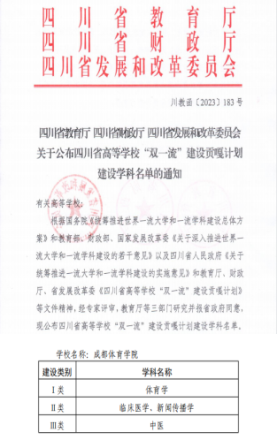 近日,四川省教育厅、四川省财政厅、四川省发展和改革委员会公布了四川省高等学校“双一流”建设贡嘎计划建设学科名单,我校体育学、临床医学(运动医学)、新闻传播学、中医成功入选,其中体育学入选Ⅰ类学科。