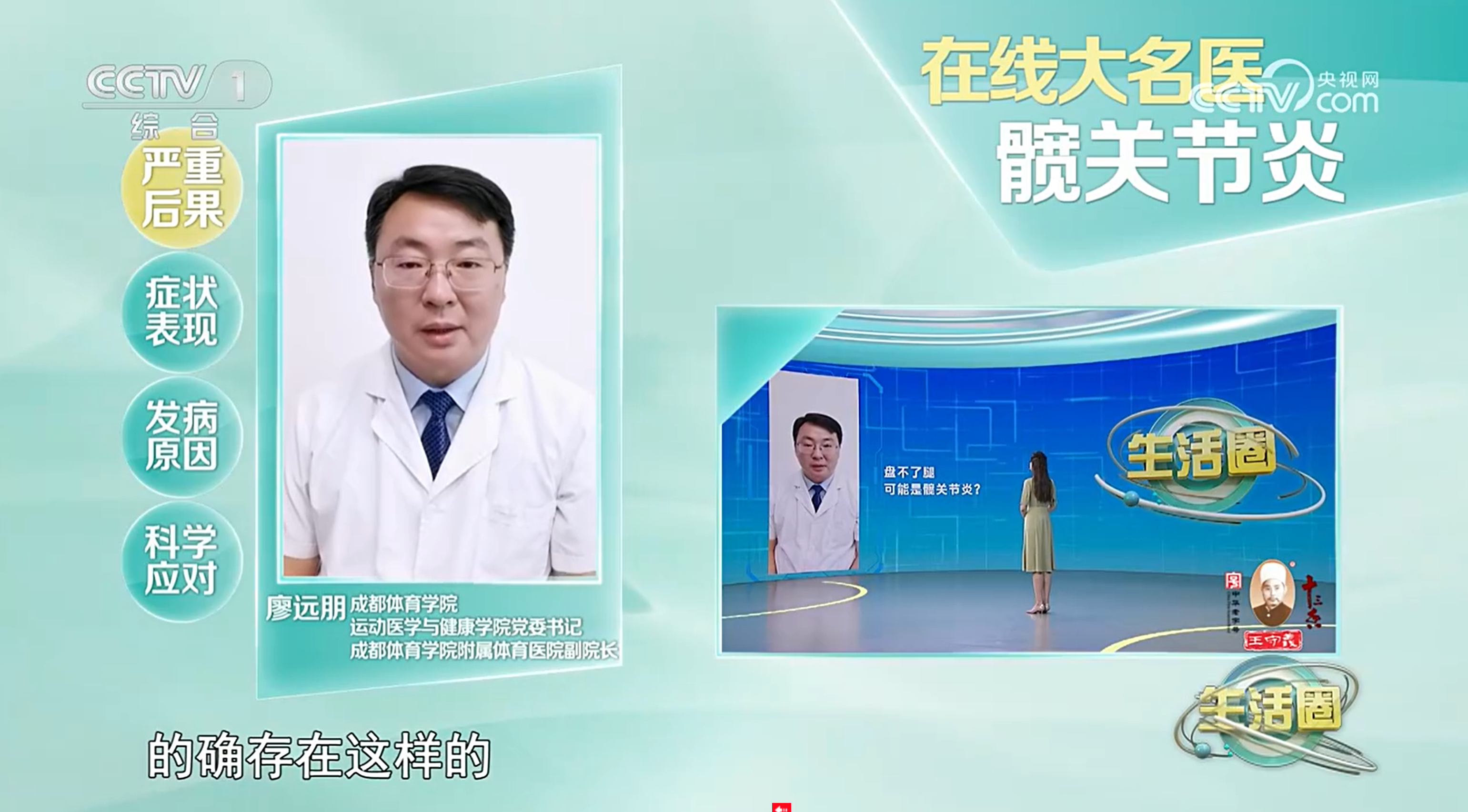 2023年7月3日,我校运动医学与健康学院党委书记,附属体育医院副院长廖远朋教授接受了中央电视台综合频道(CCTV1)生活圈“在线大名医”栏目的专访。廖远朋教授结合自己中医骨伤和运动康复方面的专业知识,针对髋关节炎的主要症状、发病原因、严重后果、治疗方案以及预防和康复方法等做了详细介绍。中央一台生活圈“在线大名医”栏目是央视在每日清晨播出的一档访谈类节目,节目邀请医疗行业不同学科的专家针对老百姓的健康问题进行专业的解答。节目形式新颖,短小精干,针对性强,观众感兴趣,听得懂,学得会,深受老百姓的好评,开播以来收视率很高,是央视的一档王牌节目。