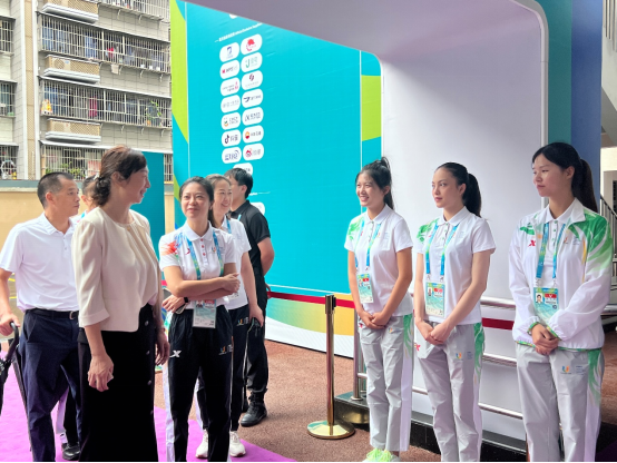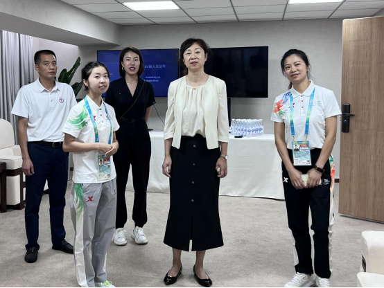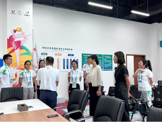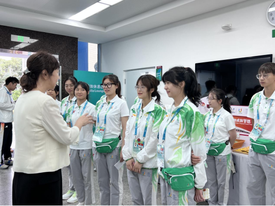 7月27日,距离大运会开幕倒计时1天,学校党委常委、副校长邬红丽带队前往成都体院艺术体操场馆中心看望慰问我校209名在岗志愿者,场馆志愿者经理、学校党委学生工作部、校团委等部门负责人陪同参与。