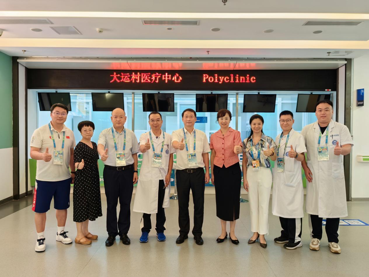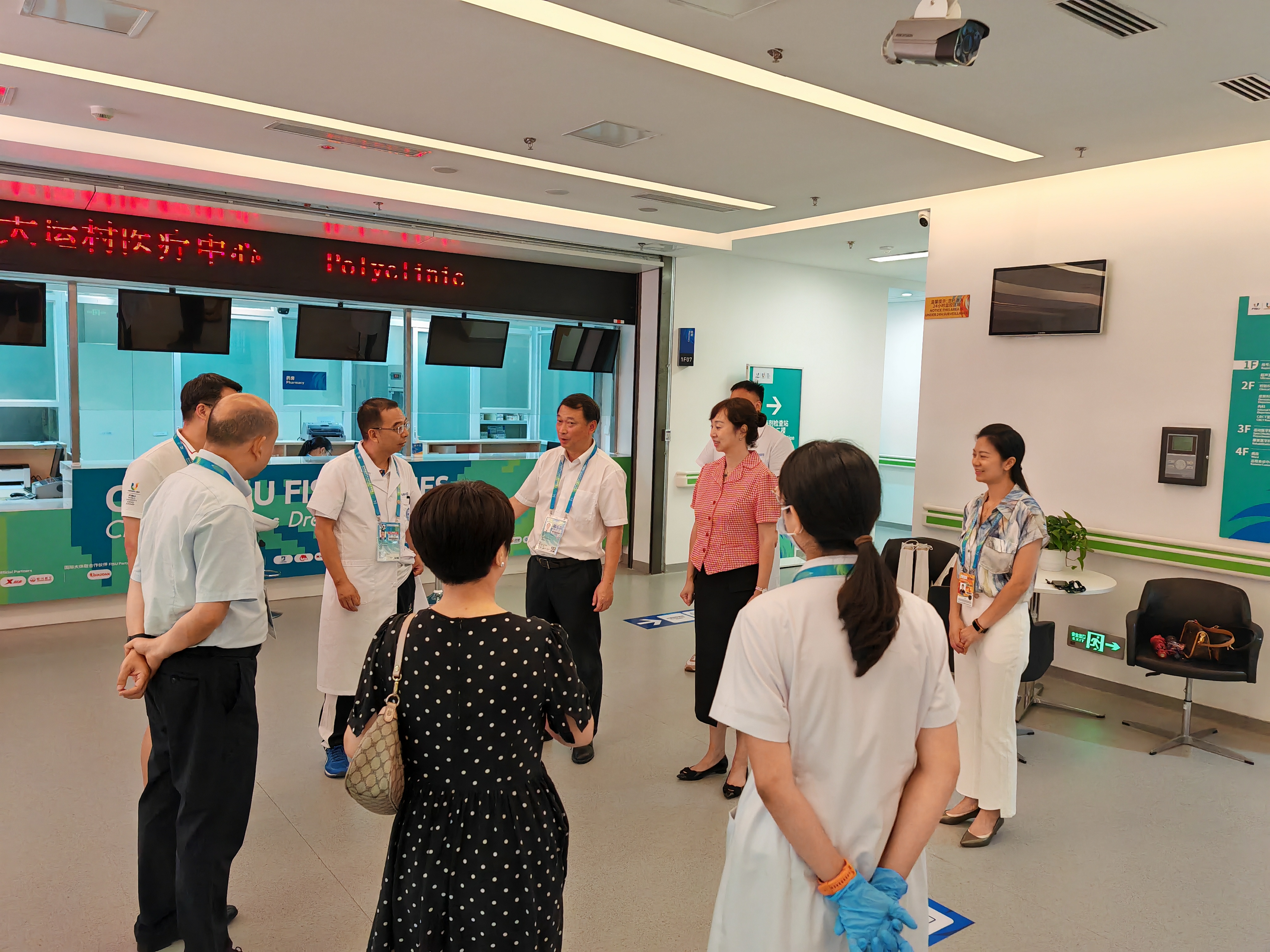 舒为平十分关心医疗保障人员在大运村的生活、工作情况。他详细询问了大运村医疗服务工作开展情况,并实地走访大运村医疗中心康复医学科/运动医学科,与保障人员交流医疗保障工作中总结的经验,对他们近一个月的保障工作予以充分肯定。