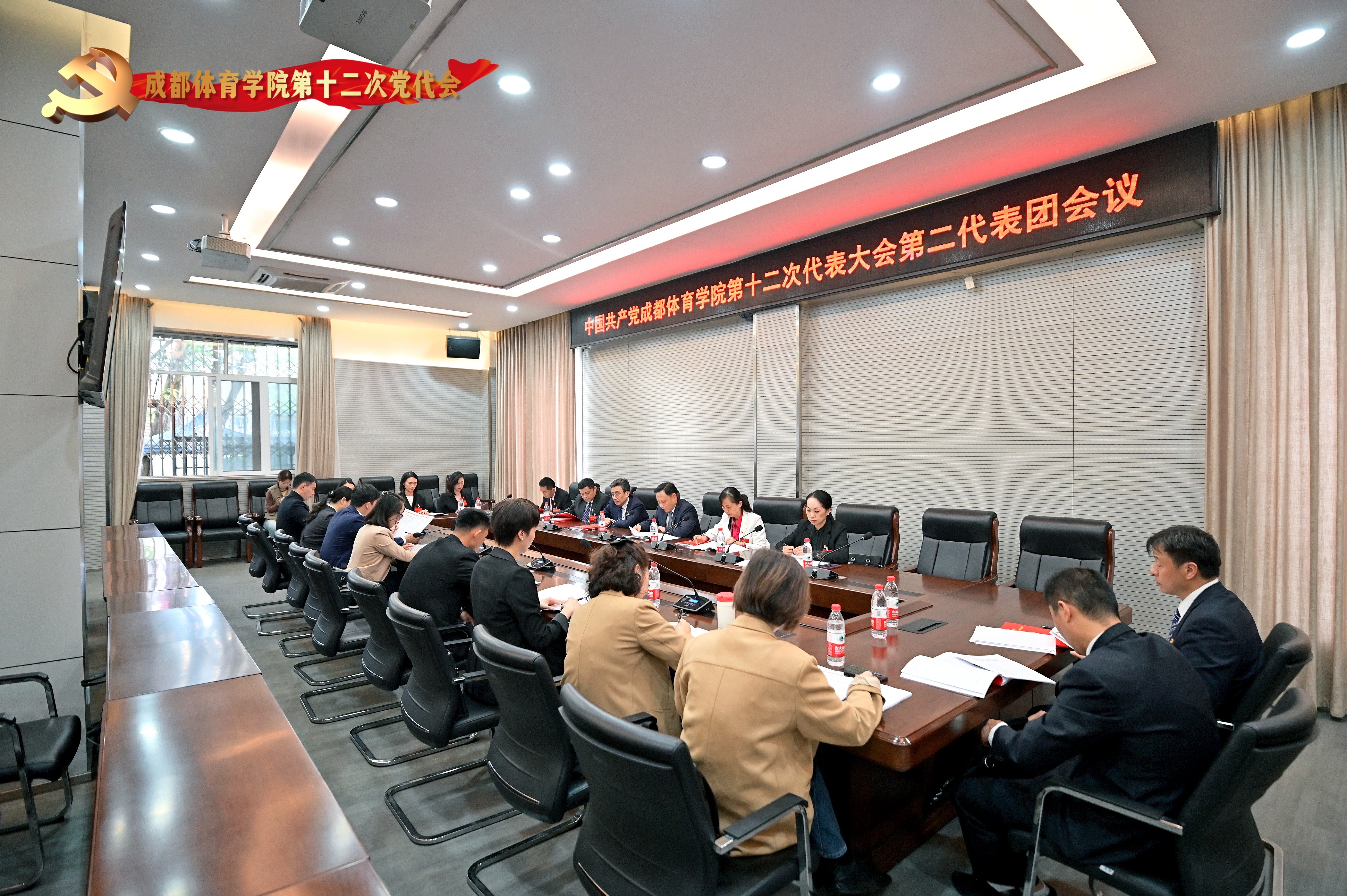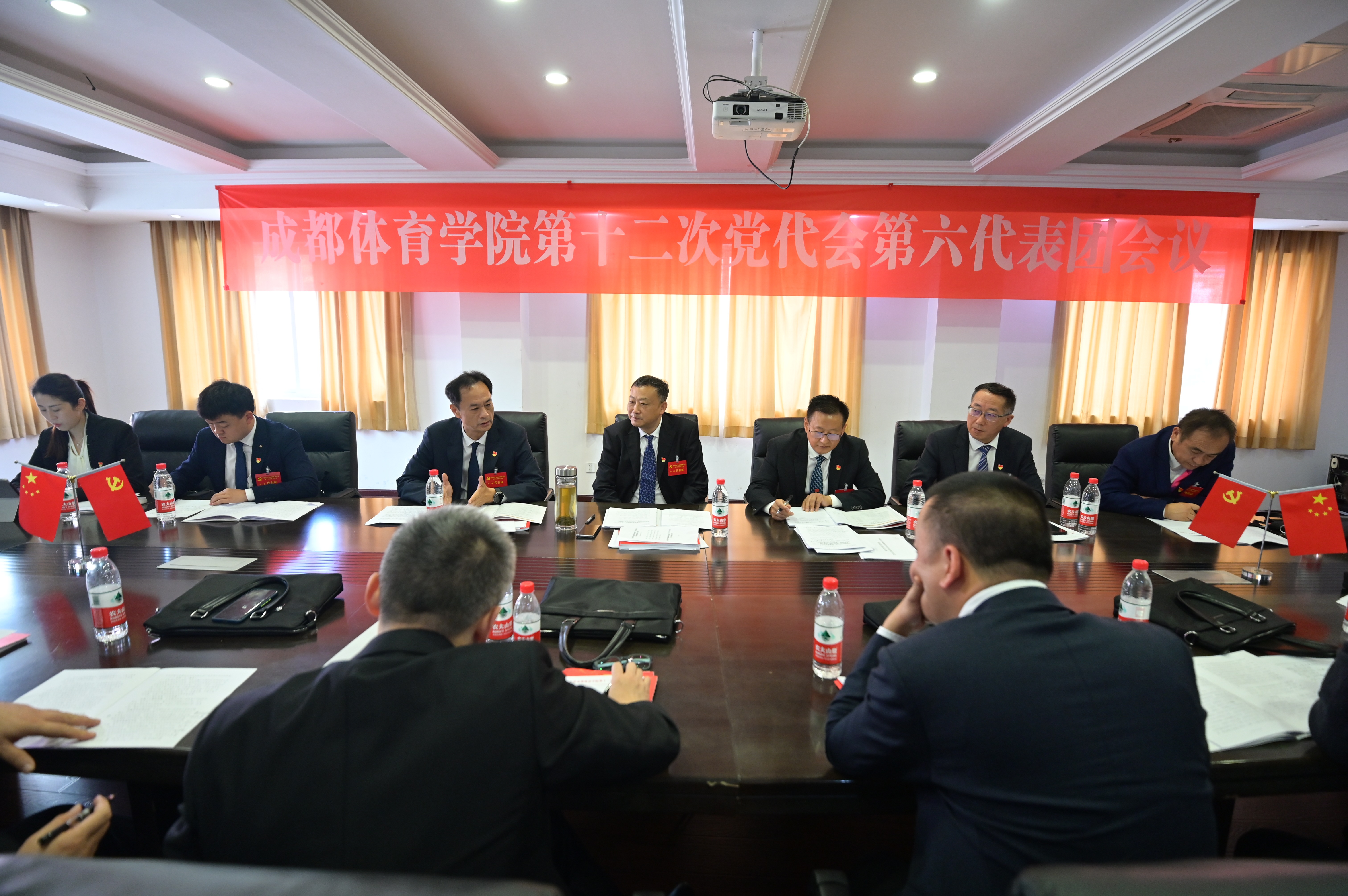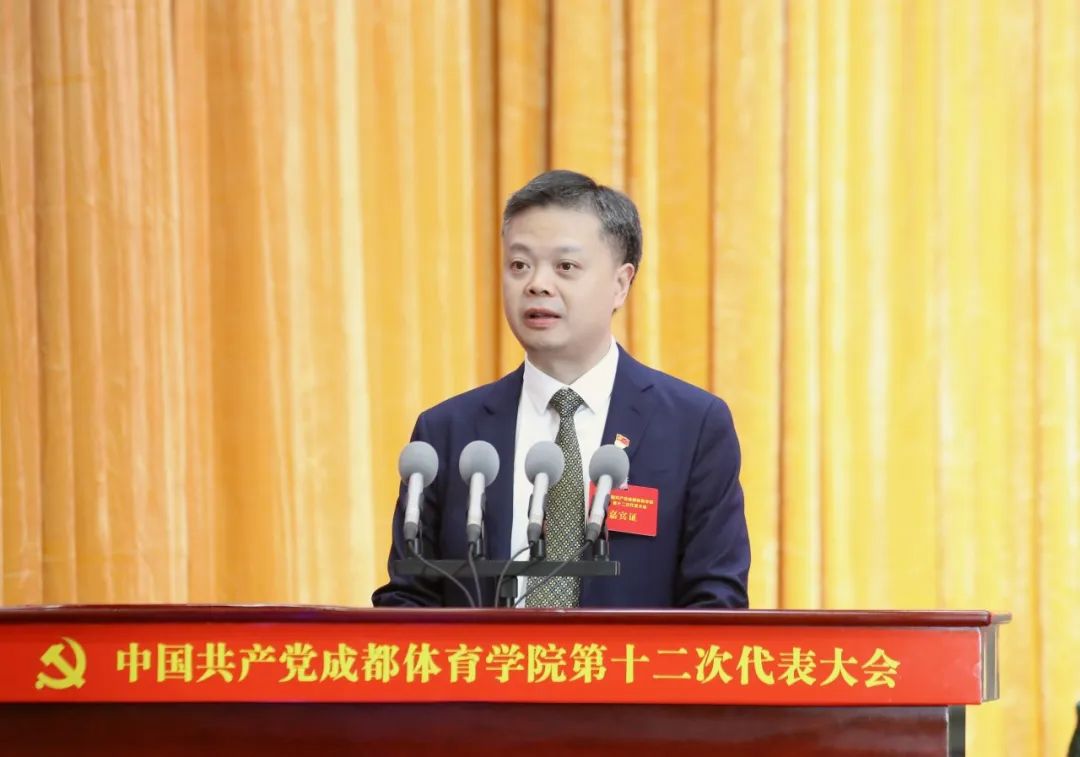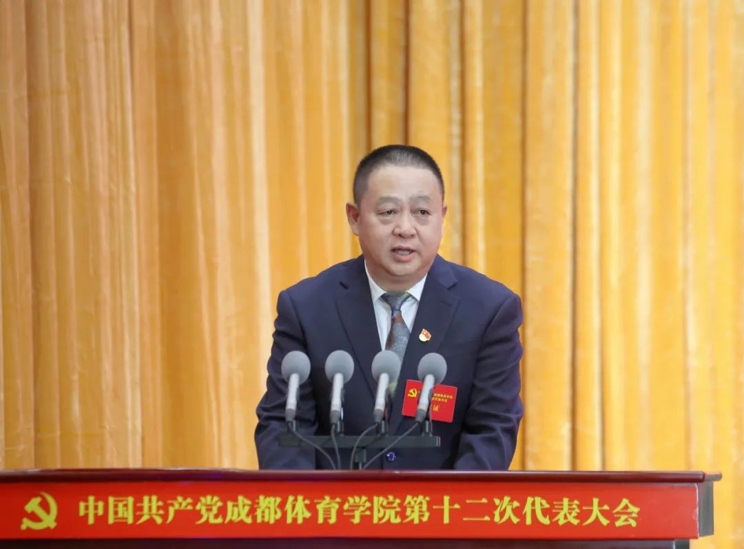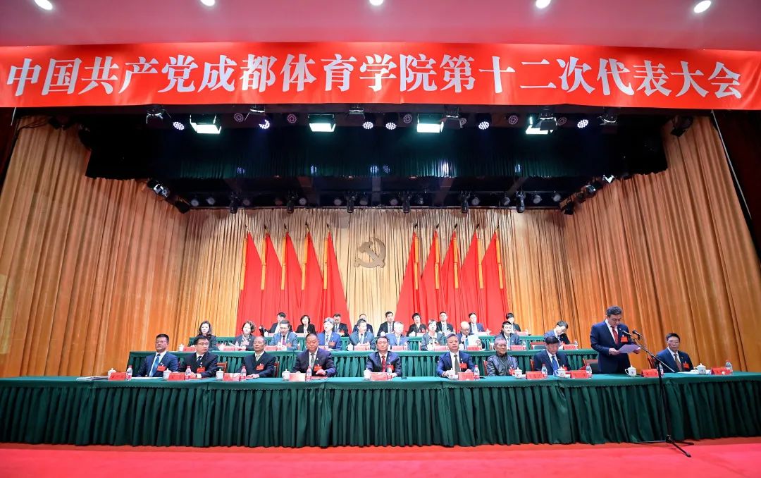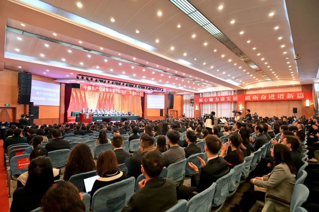 开幕会现场气氛庄重热烈,主席台上方悬挂着“中国共产党成都体育学院第十二次代表大会”会标,帷幕正中,由镰刀和锤头组成的中国共产党党徽在十面红旗映衬下熠熠生辉。会场后方及两侧分别悬挂着“深入学习贯彻习近平新时代中国特色社会主义思想,坚持立德树人根本任务,不断推进世界一流体育大学建设”“奋进新时代 争创新业绩 展现新作为”“凝心聚力谋发展 砥砺奋进谱新篇”的横幅标语。