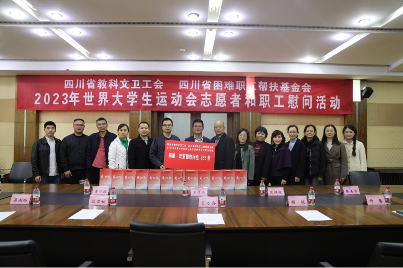 11月29日,四川省教科文卫工会、四川省困难职工帮扶基金会2023年世界大学生运动会志愿者和职工慰问活动在成都体育学院举行,四川省教科文卫工会主席王俊兵,四川省工会保障部四级调研员、四川省困难职工帮扶基金会党支部书记范鹏程,学校党委副书记胥万兵,党委常委、党委宣传部、党委统战部部长欧雪松出席此次活动,成都体育学院工会及部分成都大运会工作人员参加了慰问活动。