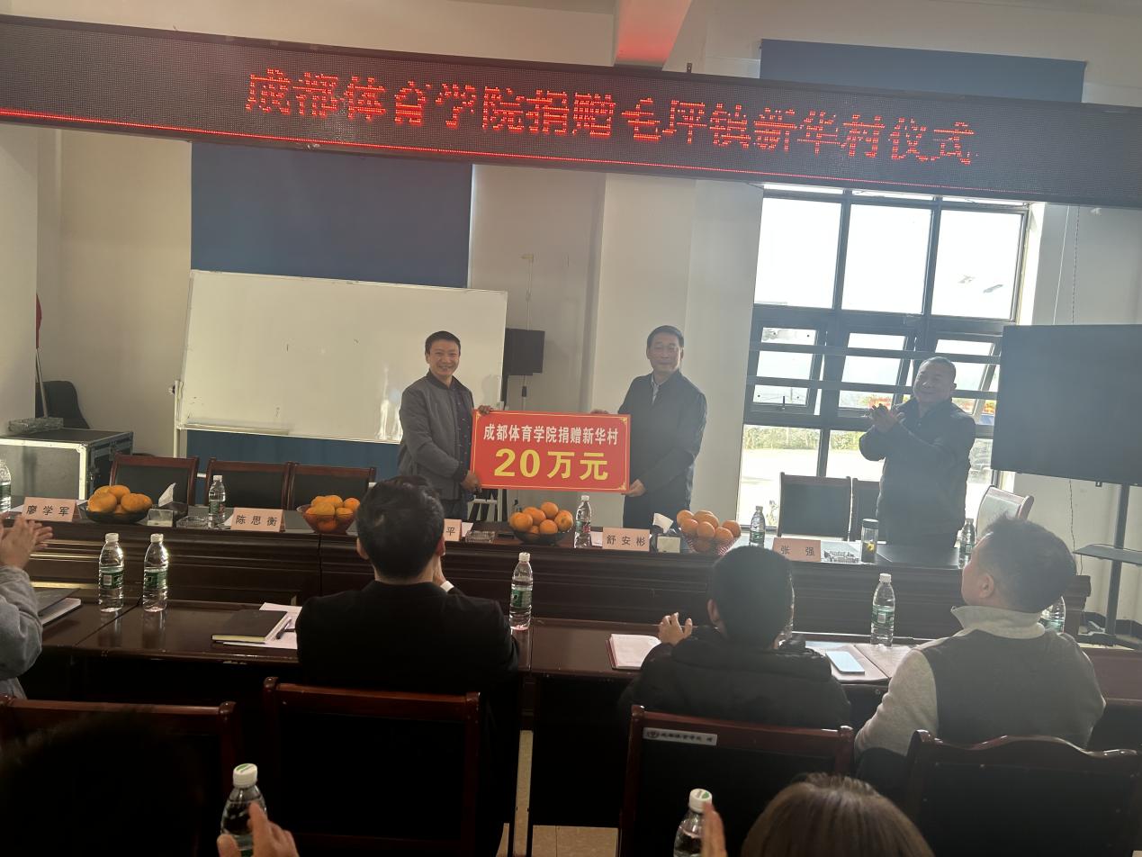 在新华村村委会,学校领导与村两委全体干部及村民代表进行了深入的交流。舒为平书记认真听取了新华村支部书记詹俊友对新华村近年发展情况及成都体育学院帮扶成效汇报,感谢峨边县各级对我校驻村干部的关心和帮助,并强调实施乡村振兴战略,是党的十九大作出的重大决策部署,是决胜全面建成小康社会、全面建设社会主义现代化国家的重大历史任务,学校将一如既往的支持新华村的发展和建设。会上,舒为平书记代表学校向新华村捐赠帮扶资金20万元。