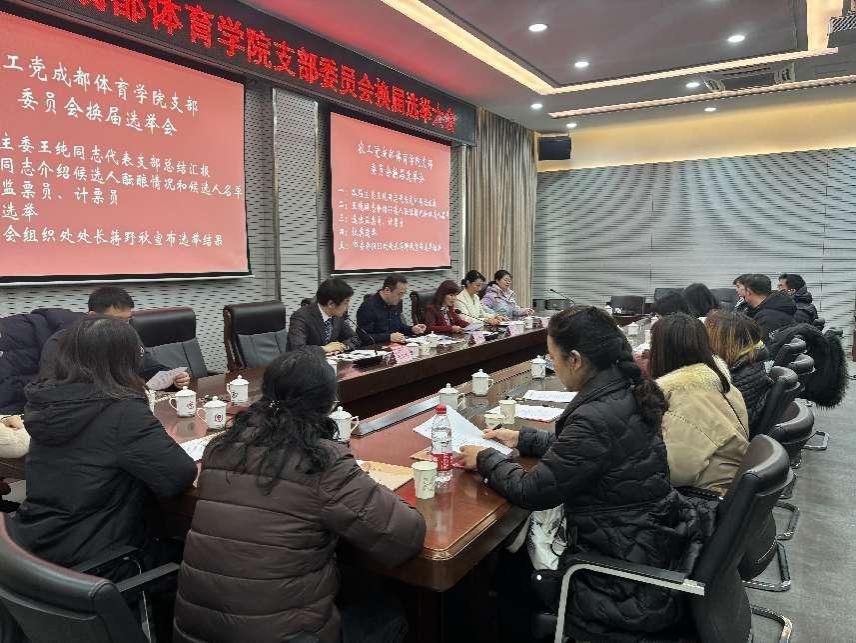 2023年12月27日下午,农工党成都体育学院支部委员会召开换届选举大会。农工党成都市委会副主委尹如铁,农工党成都市委会专职副主委胡伟峰,农工党成都市委会组织处处长蒋野秋到会指导。成都体育学院党委书记舒为平,党委副书记胥万兵,党委常委、宣传统战部部长欧雪松,农工党武侯区总支部主委陈红霞,农工党西南民族大学支部主委杨军,成都体育学院相关基层党组织代表、各民主党派及党外知识分子联谊会代表受邀出席会议。