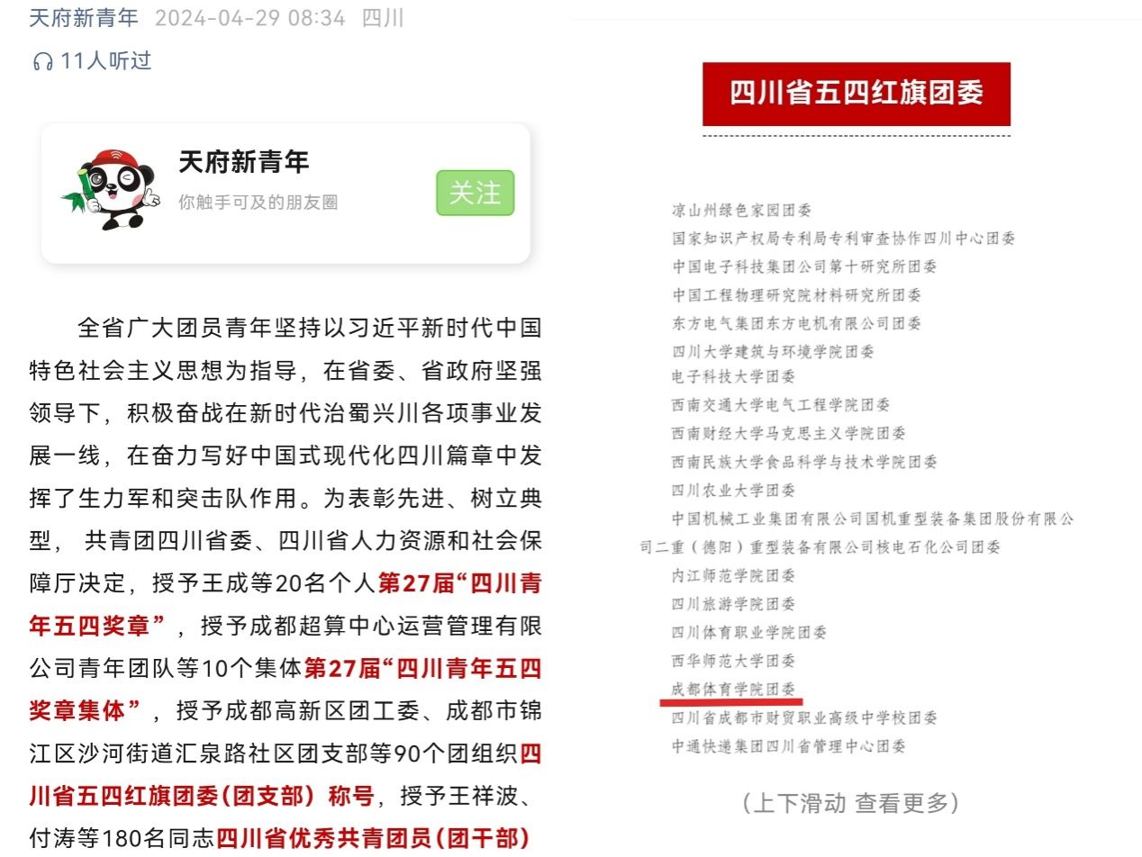 在“五四”青年节到来之际,为表彰先进、树立典型,共青团四川省委、四川省人力资源和社会保障厅公布了《关于表彰第27届“四川青年五四奖章”“四川青年五四奖章集体”“四川省五四红旗团委(团支部)”“四川省优秀共青团员(团干部)”的决定》,成都体育学院团委获得第27届“四川省五四红旗团委”荣誉称号。这也是我校团委自2012年以来再一次获得此项殊荣,本次表彰四川省共有48个单位获评“四川省五四红旗团委”荣誉称号。