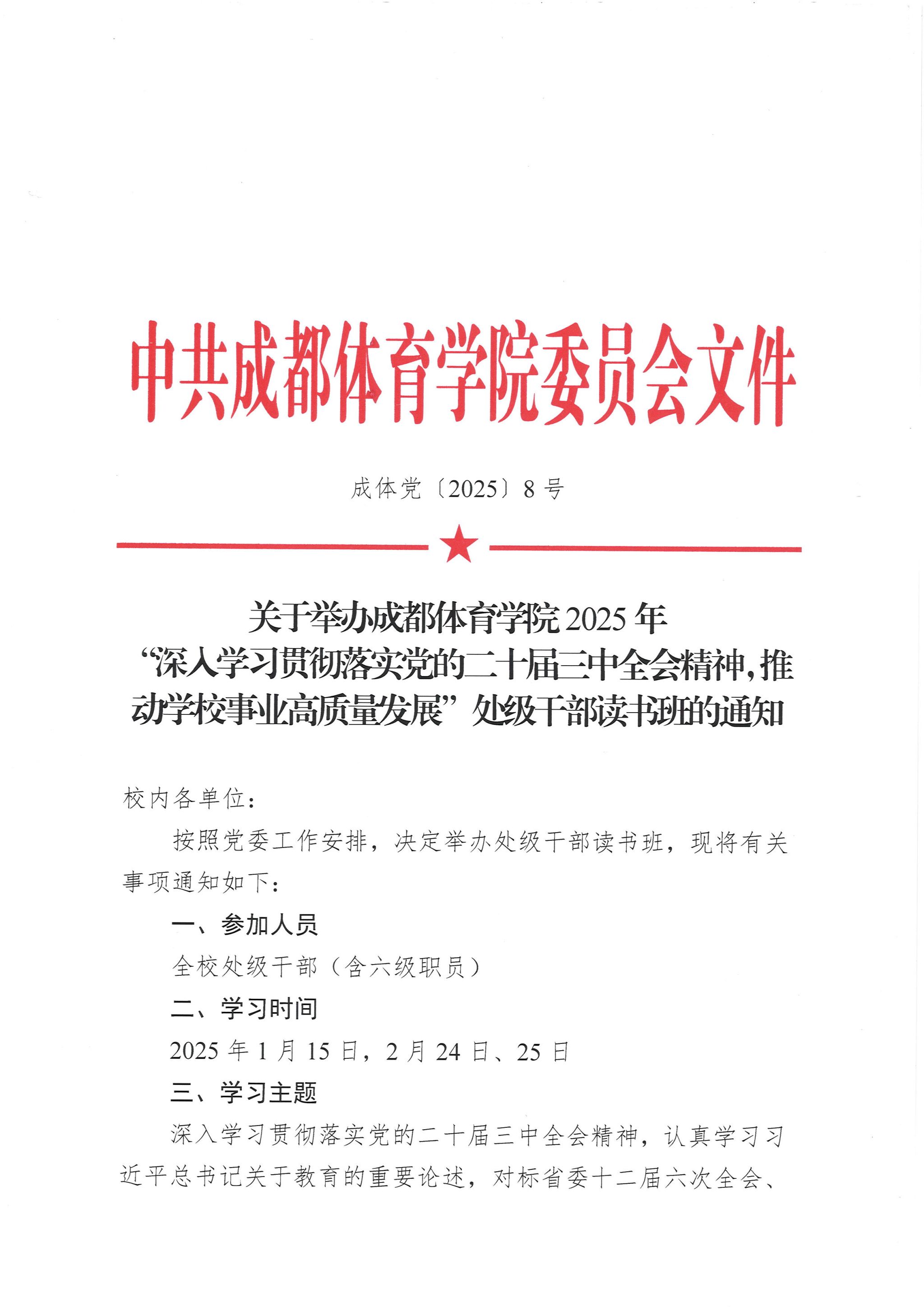 关于举办成都体育学院2025年“深入学习贯彻落实党的二十届三中全会精神,推动学校事业高质量发展”处级干部读书班的通知