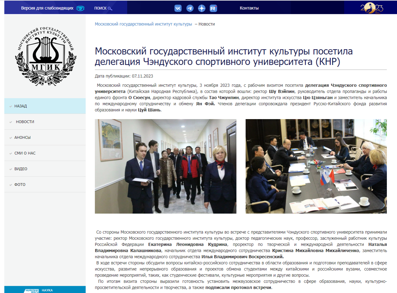 【莫斯科国立文化学院新闻】成都体育学院代表团访问莫斯科国立文化学院